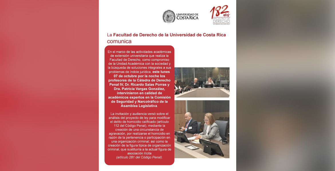 En el marco de las actividades académicas de extensión universitaria que realiza la Facultad de Derecho, como compromiso de la Unidad Académica con la sociedad y la búsqueda de soluciones integrales a sus problemas de índole jurídica, este lunes 07 de octubre por la noche los profesores de la Cátedra de Derecho Penal IV, Dr. Ricardo Salas Porras y Dra. Patricia Vargas González, intervinieron en calidad de académicos expertos en la Comisión de Seguridad y Narcotráfico de la