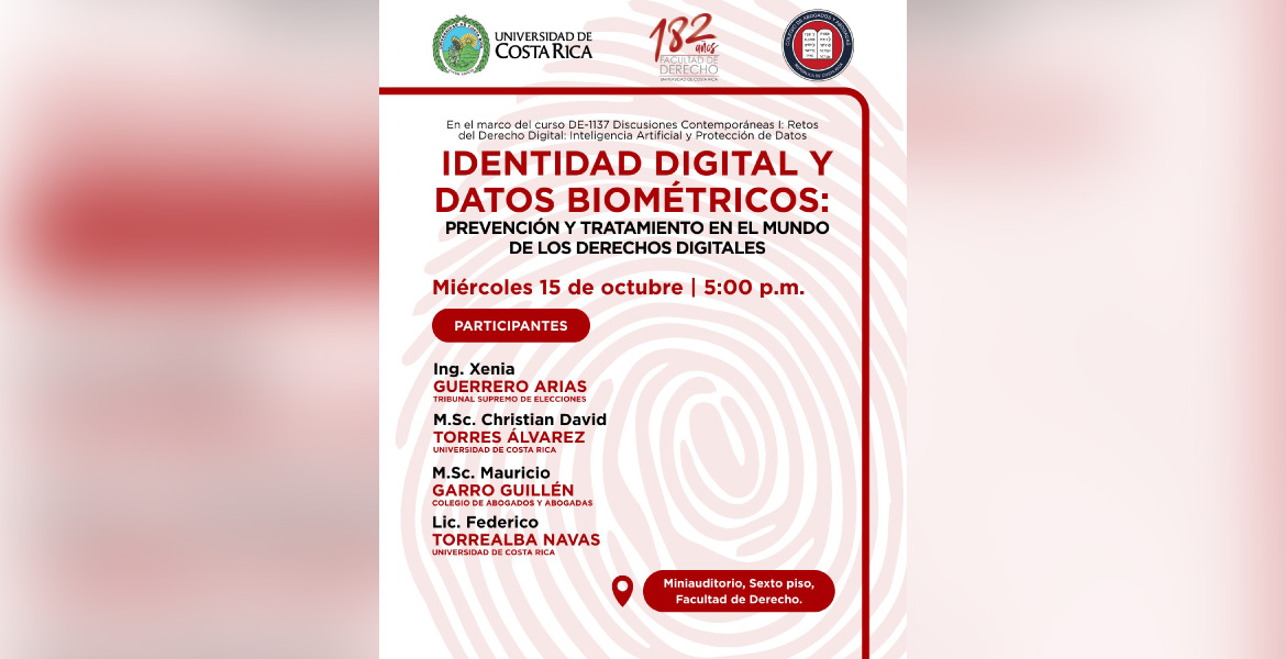 La Decanatura, el Colegio de Abogados y Abogadas de Costa Rica y la coordinación del curso Retos del Derecho Digital: Inteligencia Artificial y Protección de Datos, extienden una cordial invitación al conversatorio titulado “Identidad Digital y Datos Biométricos: Prevención y Tratamiento en el mundo de los Derechos Digitales”.