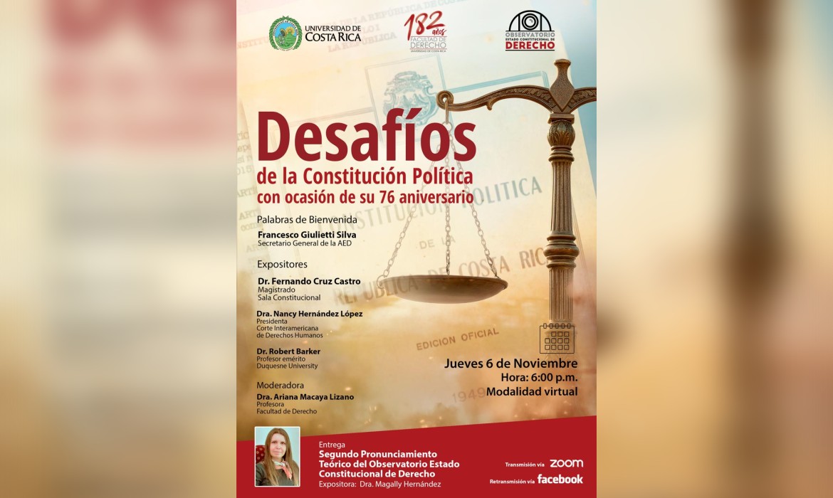 El Observatorio Estado Constitucional de Derecho les invita cordialmente al Conversatorio: Desafíos de la Constitución Política y su aplicación en la actualidad con ocasión de su 76° Aniversario, el día jueves 06 de noviembre a las 18:00 horas, a través de la plataforma Zoom.