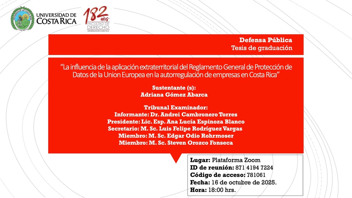 Defensa Pública de Tesis: "La influencia de la aplicación extraterritorial del Reglamento General de Protección de Datos de la Unión Europea en la autorregulación de empresas en Costa Rica"