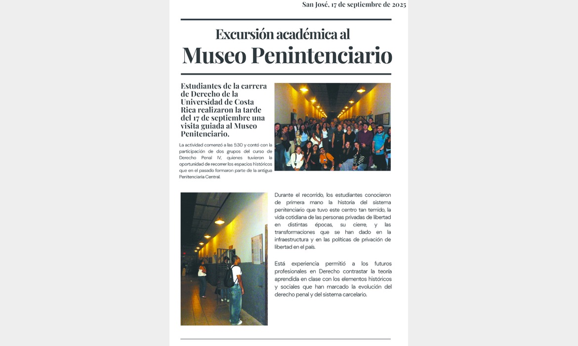 El día de ayer 17 de setiembre estudiantes y docentes de la Cátedra de Derecho Penal IV visitaron el Museo Penitenciario ubicado en el Centro Costarricense de la Ciencia y la Cultura, que alberga también el Museo de los Niños.