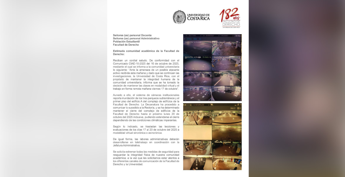 Aunado a ello, el sistema de cámaras institucionales reporta inundación de los tres parqueos subterráneos y el primer piso del edificio A del complejo de edificios de la Facultad de Derecho. La Decanatura ha procedido a comunicar lo sucedido a la Rectoría, y se ha determinado mantener el cierre del complejo de edificios de la Facultad de Derecho hasta el próximo lunes 20 de octubre del 2025 inclusive, pudiendo extenderse el cierre dependiendo de las condiciones climáticas imperantes.