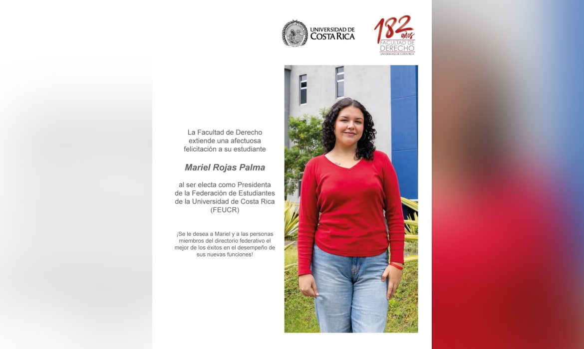 La Facultad de Derecho extiende una afectuosa felicitación a su estudiante Mariel Rojas Palma, al ser electa como Presidenta de la Federación de Estudiantes de la Universidad de Costa Rica (FEUCR)