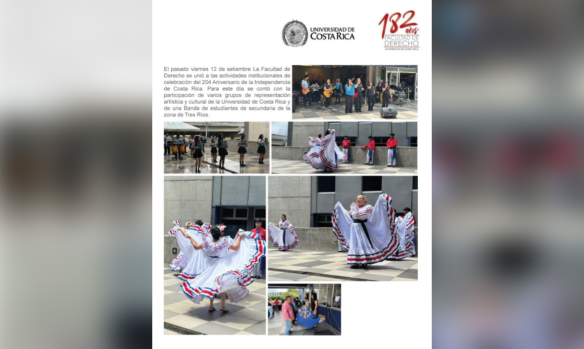 El pasado viernes 12 de setiembre La Facultad de Derecho se unió a las actividades institucionales de celebración del 204 Aniversario de la Independencia de Costa Rica. Para este dia se contó con la participación de varios grupos de representación artistica y cultural de la Universidad de Costa Rica y de una Banda de estudiantes de secundaria de la zona de Tres Rios.