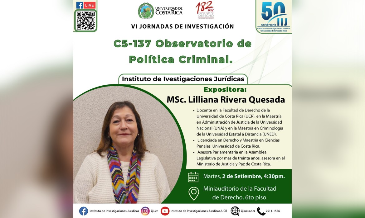 Jornadas de Investigación: Observatorio de Política Criminal 2025-09-02 4:30 p.m. Miniauditorio, 6to piso, Facultad de Derecho, UCR