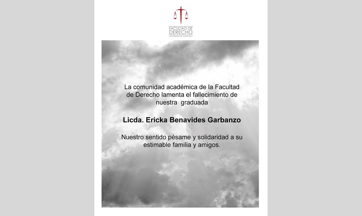 La comunidad académica de la Facultad de Derecho lamenta el fallecimiento de nuestra graduada Licda. Ericka Benavides Garbazo.
